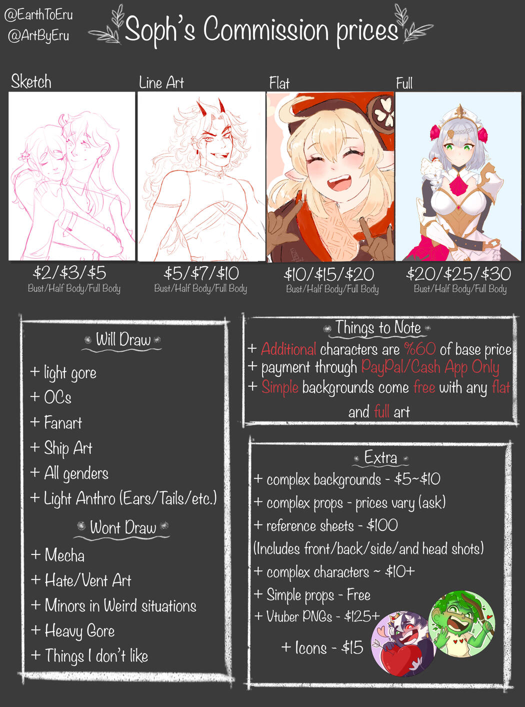 Hullo! Welcome to my commission page!Please feel free to check out my prices and below! *Payment will only be accepted through PayPal.Also, please note that these are prices for non-commercial commissions!Please contact me if you have further questions! DM me on twitter or Email me at [email protected] :]TERMS OF SERVICE